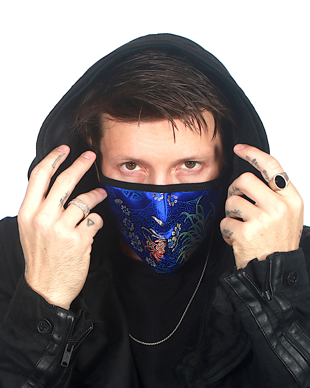 A non-medical grade face mask made out of our silk brocade material in blue with a floral pattern. One size fits all. DO NOT MACHINE WASH - hand wash with delicate detergent and hang dry.