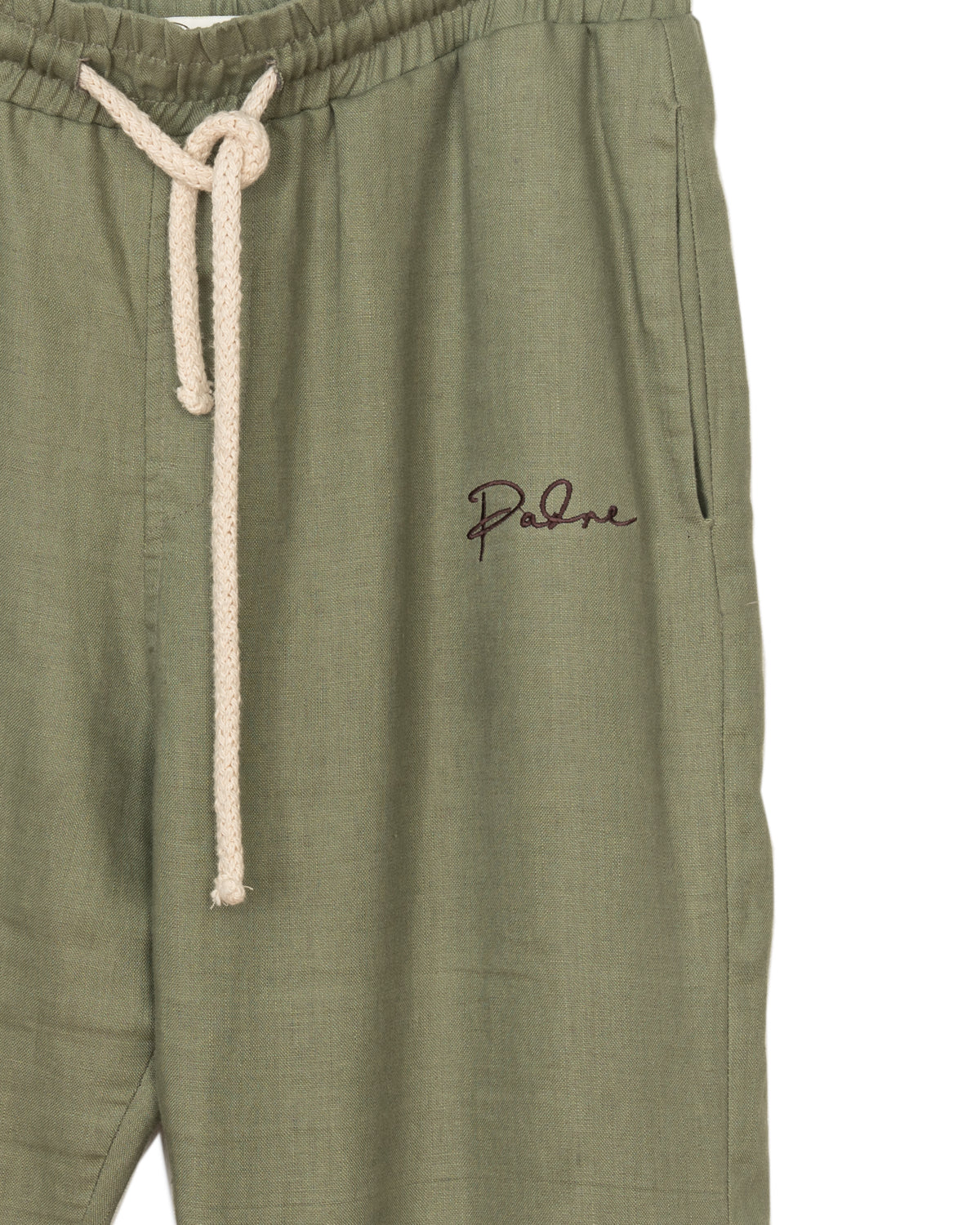 Our signature silhouette slouch pants in olive linen. Details include the Padre logo embroidered in brown on the wearers left thigh and an oversized natural rope drawstring.